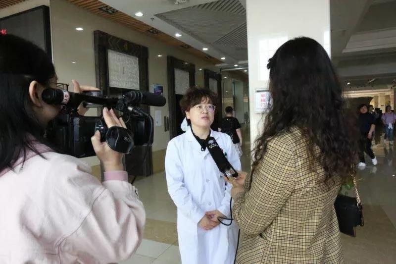 图为电视台记者在采访义诊医生