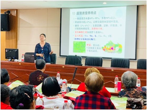 2. 科普讲座:专委会副主任委员周才琼教授针对社区居民,进行了一场关于“多吃蔬果、平衡膳食”的专题健康讲座。能容纳近100人的社区便民服务中心会议室被热情的居民填满,每当讲到居民特别感兴趣的地方,周教授还不得不停下来为居民答疑。原本预计40分钟的讲座最后持续了近2小时。